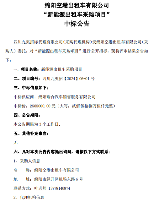 綿陽空港出租車有限公司 “新能源出租車采購項目” 中標公告