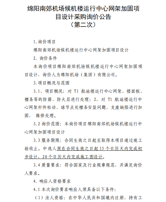 綿陽(yáng)南郊機(jī)場(chǎng)候機(jī)樓運(yùn)行中心網(wǎng)架加固項(xiàng)目設(shè)計(jì)采購(gòu)詢價(jià)公告(第二次)